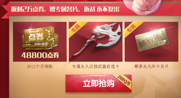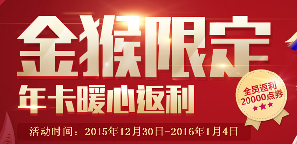 2 推出金猴限定年卡,288QB/张,单大区限买一次。购买年卡后立即到账4800点券;2016年2月至12月,每月可在本活动页面领取4000点券。累计获得48800点券,价值488QB。当月未领取的点券将在下一月失效。每月领取4000点券后,推荐购买每月激战必备,助你畅快激战。
