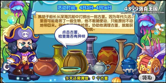 洛克王国沉船宝藏 黑胡子船长在深海沉船中打捞出一批古董,希望寻找高手帮他检查。协助他清理古董,就可以获得丰厚奖励哦!