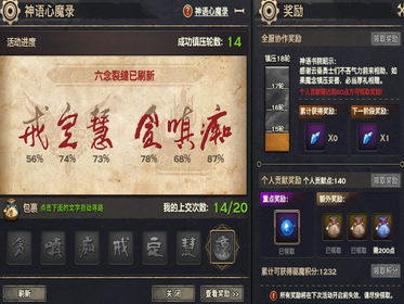 每周活动完之后根据积分能领取一点点驱魔积分,也很少。所谓一轮就是每交一个字,对应书卷上那个字会显示完成度为百分之多少,6个字都达到100%的时候算一轮。区不算太鬼,18轮应该能完成吧,但是个人感觉奖励不太好,之后工作室多开小号刷这东西,字肯定就不值钱了,所以你们也别抱太大希望。