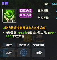 (注:实际上白露在使用瞬间就会产生第一次治疗效果,随后每秒一次治疗,也就是说最后0.9秒引导实际上没有任何意义,治疗效果已经都出完了,可以直接用跳打断来放其他瞬发技能,例如青蔓或者月落甘霖)