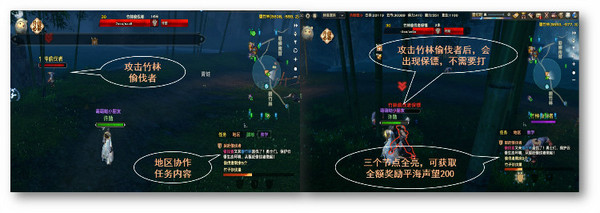1)驱赶偷伐者:打怪任务。任务开始后会出现10个竹林偷伐者,打怪可获取节点奖励。注意打竹林偷伐者的时候,会出现竹林偷伐者的保镖,忽略保镖即可。100%声望奖励为平海镇声望200,预计时间三分钟。