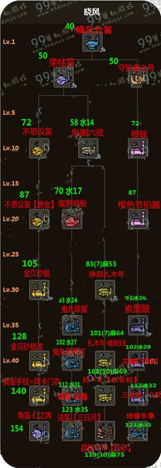 从图中可以看出晓风系靠左边的分支为全部加攻击的武器。对于一个辅助笛来说。伤害其实都是可以忽略不计的~