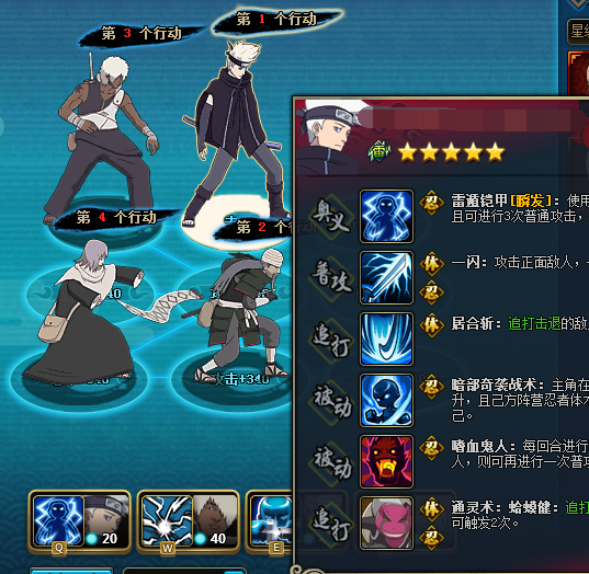 第四回合:依然是卡卡西两刀不可以出连击,等香燐普攻完了以后也是看情况,如果雷两刀加达鲁伊普攻都没有出连击就补上达鲁伊奥义(如果你很不幸第二回合把达鲁伊奥义用掉了这个回合也没出连击,那么重来);这个回合最好连击要普攻出,不要浪费达鲁伊奥义,否则下一波打自来也很难带走