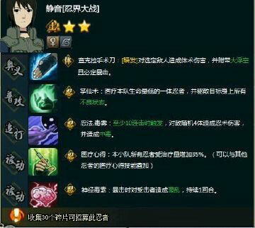 被动:医疗心得:本小队所有忍者受治疗增加35%,(可以与其他忍者的医疗心得技能叠加);