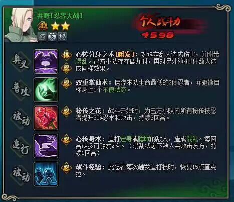 首先是忍战井野,奥义变为了瞬发,且有小队中有鹿丸在场时会对随机可以对另外随机一体造成同样效果,奥义层面上比泳装井野更好用,是一个比较强力的控,但是小队中必须存在鹿丸也有比较大的局限性;