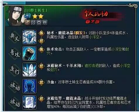 下面两个被动非常厉害,被动一对非秽土忍者造成30%额外伤害,被动二风水结界40%攻击和忍术,也就是说这个忍者自带70%buff加成,可以说是很bug的能力了,也许这也是其奥义攻击只能打四体的原因,因为输出太强力了。在目前秽土还没有量产的版本中,对非秽土忍者的额外伤害堪比水影对男性忍者的伤害buff