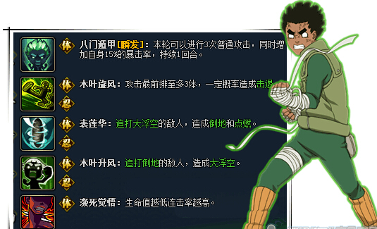 本轮可以进行3次普攻,并且增加自身15%的暴击率,看来是个爆发忍者呀!若配合上增加暴击率的忍者,或给予buff的忍者,对于前面的敌人将会造成很大的压力。