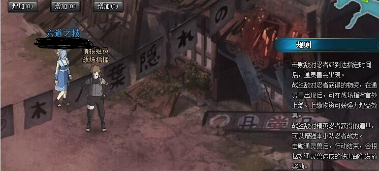 在清掉敌对忍者(或者达到一定时间)之后,所要抓捕的通灵兽就会出现。这里要注意的是,在攻打通灵兽之前,要把自己获得的物资奖励到情报npc那里上交,以此来提升组织成员的属性