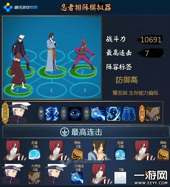 答:我告诉你一个 可以连续发招七次 三星佐助+二星雏田+二星勘九郎(或蝎)主角要有通灵兽 【蓝蛇】 主角天赋用 阵容这样搭配 虽然不是很厉害但是打血很多,很推荐这样....... >>详细