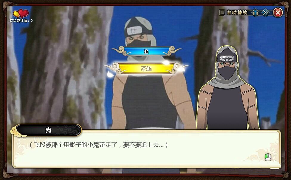 这时候的木叶一行人已经开始商量对策,基本上角都也猜到他们要分开不死二人组,飞段这个笨蛋也的确是上了鹿丸的当,被牵走了。要不要追上去呢?出现2个选项: