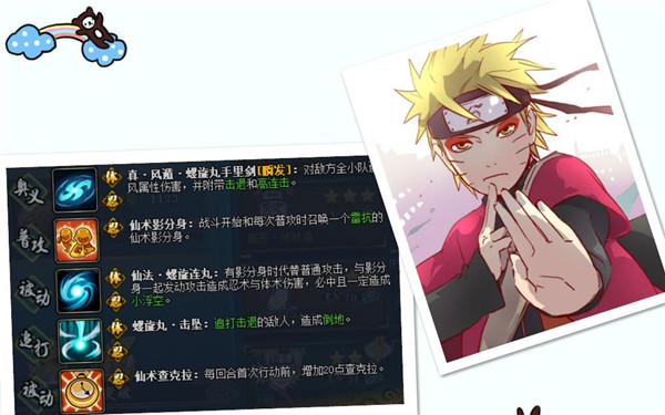 仙鸣可以说是游戏目前最良心、最平民的实用忍者了,奥义有着较高伤害,普攻配合着被动可以造成稳定的起手!相对的比普攻鸣人多了一个追打技能!被动仙术查克拉配合我爱罗这种需要高查克拉的忍者有着很大的优势!这里重点是仙鸣的分身!仙鸣的分身有着超高的血量,并且分身存在时普攻可以造成稳定的起手,死亡时仙鸣放弃普攻行动改为重新召唤一个分身!所以想杀分身后面的忍者,可算是难上加难了!