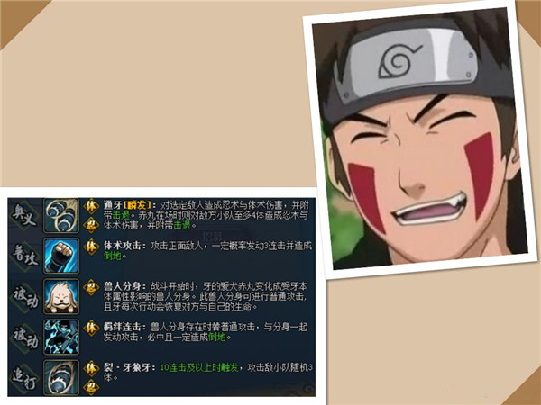 水主淬毒队的大将!基本在70(不包括70)以下的仙界战场压级水主玩家必备的一个忍者!和鸣人一样配合分身稳定起手,牙的分身也有很高的血量,并且在行动时会恢复自身和分身的量。追打10连可以快速的进行三体淬毒效果。奥义伤害也是很高的!缺点在于分身死掉无法复活。所以分身死掉=少了一个技能。但是分身血量也很高的。就算死掉也吸收了成吨的伤害。保证了后面忍者的生存。