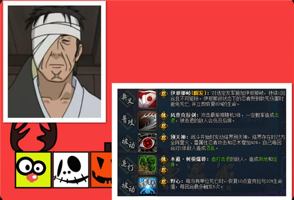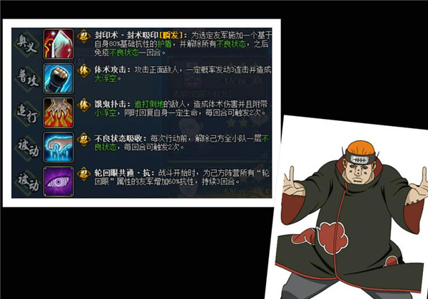 团藏没有分身,但是他的奥义可以让友军即使是一个脆皮也能抗住成吨的伤害,唯一不足的是奥义会让友军在被吊打的过程中复活。。。所以就算你死了,奥义把你救活敌方如果连招没有打完还会继续打你。。。被动的结界可以有效的增加小队相应属性忍者的攻击属性、并且每回合首次行动之前会进行控制敌方随即忍者,这个被动也恶心,可以随即造成先手、后手的控制效果,很容易切断敌方的追打衔接、追打控制可以配合忍者奥义进行点控、魂吸增加了自己的生存能力。也是一个多面手!