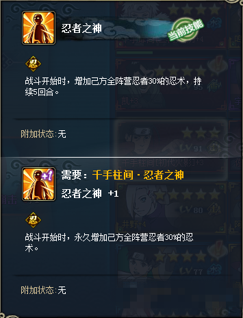 要注意一点,就是初代的使用方法,可以配合多次普攻的忍者,达到首回合结界加定身的效果,唯一缺点是加上主角的话,忍者太过于局限化,只剩下了一个空位。