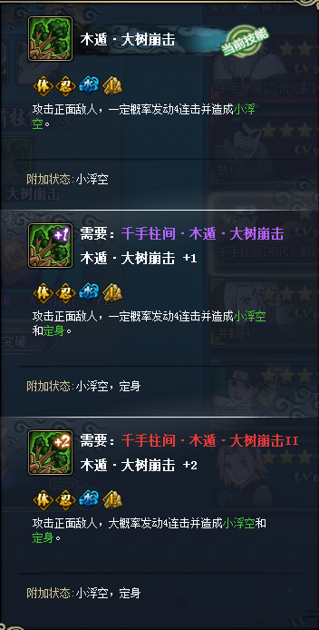 答:木遁·树界降临(奥义):发动结界树界降临。在此结界中每回合首次行动前将敌方随机2个目标造成伤害与定身效果。 木遁·大树崩击(普攻):攻击正面敌人,一定概率发动4连击并造成小浮空。 忍者之神(被动):战斗开始时,增加己方所有忍者的人数... >>详细