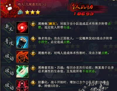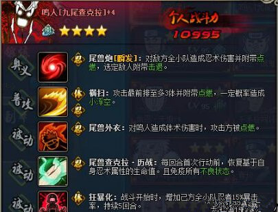 在鸣人生日庆典活动中可兑换九尾鸣人的碎片,3星九尾升得4星获得新形态,技能也有些改变,普攻攻击前排3体并点燃,获取难度非常高,能升4星九尾的玩家都是真正的壕们,四星九尾放在排位配合水主淬毒,扫前排点燃上毒,效果非常好。