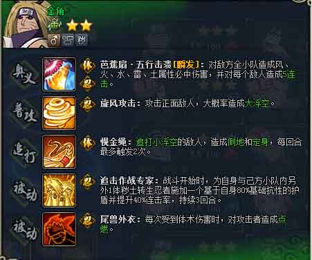 答:青 A- 个人认为是五影护卫里比较强力的一个,动漫里唯一一个能识破团藏别天神的人。奥义瞬发能封穴,关键是进场无CD,给对方的关键人物使用的话就直接废掉了对方,并且追打也带封穴,原来天道之所以强,就是他的追打封穴功劳很大。此外两个水分... >>详细