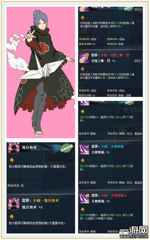 答: 式纸之舞·罚(奥义):对选定敌人和所有标记状态的敌人造成大量忍术伤害。 纸吹雪(普攻):攻击正面敌人,必定造成标记,一定概率发动3连击并造成倒地。 纸分身术(被动):极大概率闪躲每回合的第一次普通攻击。 神之天使(被动):开场时为... >>详细