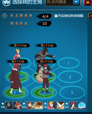 第一回合:风主奥义清三体状态,勘九郎起手,有傀儡的勘九郎百分百起手。造成连击等蓝回到60查克拉,长门可以再清除一体状态 或对下回合想攻击的忍者造成伤害。