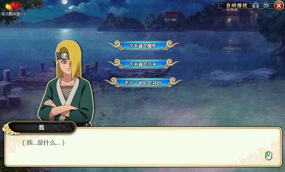2.选择不,艺术是爆炸→获得5羁绊,然后参与一场战斗(迪达拉+2粘土鸟VS蝎),继续剧情
