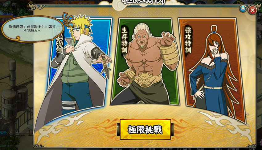 急速特训中“雷主+达鲁伊+凯+三船”阵容非常变态,不仅先攻要求高,而且攻击高,雷主暴击带嗜血鬼人的情况下打谁谁怀孕,封雷斩也是分分钟秒人的。网上有一个阵容“雷主+七尾芙+泳装井野+伊鲁卡”,主要通过混乱让对面狗咬狗打,小编试过,打了十几个小时都没过,非常刷脸,下面介绍一下小编刚刚通关的阵容——风主+黑飞段+奇拉比+青