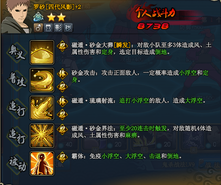 综合评语:罗爸爸的重点在于奥义非常强大,3体定身,非常适合小队作战,可惜查克拉需要80,越早释放对战斗越有帮助,所以突破U是最好的搭配,可以轻松第2回合获得足够查克拉释放奥义,也能顶掉对方结界降低对方输出,普攻概率一般,罗爸属于输出型忍者,奥义输出中高,并且拥有2个追打,20连击触发的追打附带2回合麻痹,非常有用,伤害也高,尽量触发。虽然有霸体,但是血少,勉强可以站前排。我个人觉得罗砂是值得升3星的,不得不赞一下,罗爸爸的技能图标,很赞,有木有!