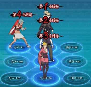 第一回合:手鞠普攻起手就是一套,就算手鞠不出,花佐、风主分身也可以造成小浮空一套COMBO,回合末七尾回复查克拉后可选择性奥义,打雷根性不建议,可留到下回合,对面是其他阵容的情况下都可以,群体点燃很给力;