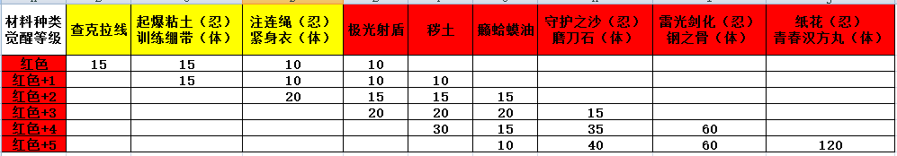 忍者的觉醒需要花费觉醒材料,其中觉醒材料有些是所有忍者通用的,而有些则是仅供忍术培养方向或者体术培养方向的的忍者使用,具体对应的材料花费如下表所示(红色+5为100级才可以觉醒):