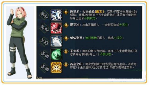 首先是技能图,从技能来看,忍战小樱是一位纯辅助忍者,并不能像水手樱一样有强大的后期攻击力。据悉,忍战樱的奥义进场冷却一回合,CD三回合,其他技能就不再一一展示