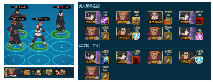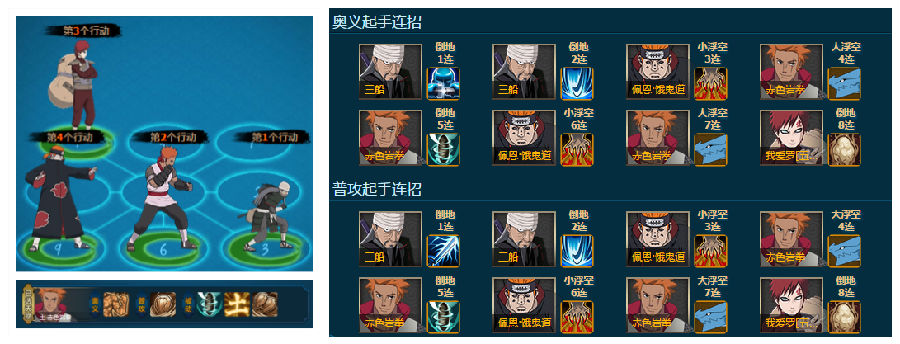 回合2:需要根据对方的阵容来使用奥义,假设对方是叠盾根性雷主,那么我使用三船奥义清除他一个重要忍者的所有BUFF并且COMBO定身,然后进入回合平砍阶段,土主跟我爱罗都可以叠盾,回合结束。