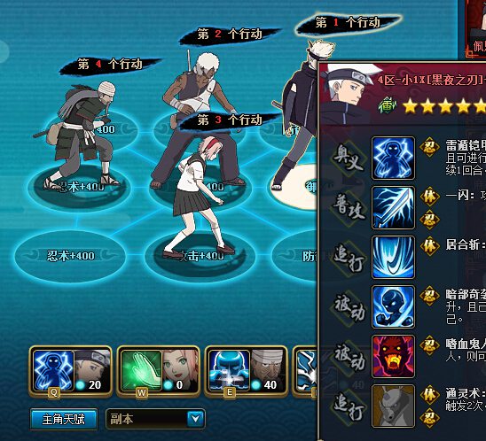 答:站位与主角天赋如上图,通灵兽如果有橙犀牛雷主追打就是居合斩,如果没有就根据自己的通灵兽选择追打最高的那个。 下面简要说下打法: 第一回合雷凯,切死对面小兵压力不大。红奥义阿斯玛。 第二回合阿斯玛奥义。下回合伊鲁卡奥义就到团藏了。由... >>详细
