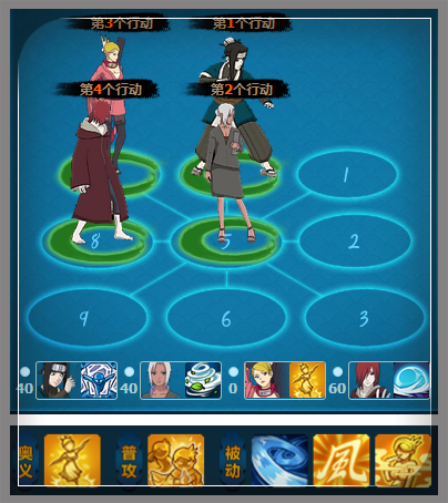 介绍完了雷土长门的阵容,下面轮到了风主妹子咯,风主阵容的优势就是他的刷新咯,但我还是比较喜欢水主的-,-,后面会说到水主,风主的特点刷新可以在一轮奥义之后刷新继续奥义,免去了冷却的麻烦,下面是阵容: