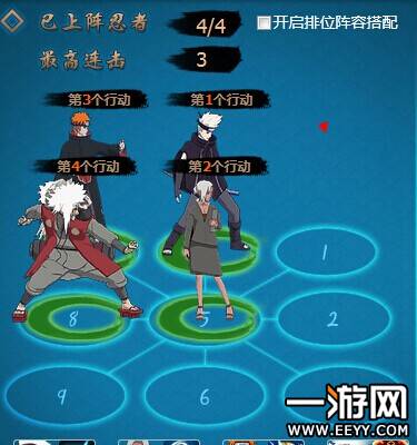 首先要看站位图。在图中用数字给大家标注了忍者站位的出手顺序,但是这个顺序遵循的是数字越小,忍者追打触发判定越靠前的设定。按下图: