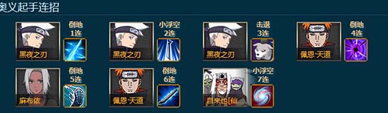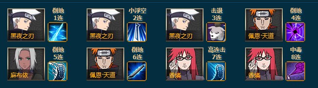 追打的机制目前就是这样,还有一点就是追打高连击这种效果,会判定到阵容最后出手,比如追打十连击,十五连击这种,也就是说追打攻击段数的会在combo最后进行匹配。看下图追打,将自来也替换成香磷: