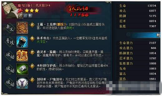 三代火影的生命、抗性资质最高,攻击资质最低,火属性,具有男性、木叶、影三个标签。