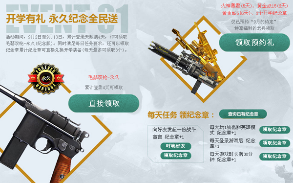 2Ô¤Ô¼¹ý8Ôµ׵ġ°9Ô¿ªÑ§Ô¤Ô¼ÌØÈ¨¡±µÄÍæ¼Ò¿ÉÒÔÁìȡԤԼÀñ,µ«½öÏÞÁìȡһ´Î£¬ÄÚº¬£º3¸ö¼ÍÄîÕÂ+»ðÉñ±©¾ý(5Ìì)¡¡+»Æ½ðAR15(6Ìì)+»Æ½ðM95(6Ìì)£»