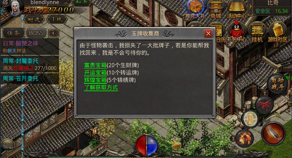 首先,我们通过任务提示中的“事件-丢失的玉牌”任务可以触发玉牌的前置系列任务,完成一系列的收集拜访任务之后,我们就可以开启玉牌兑换功能了。接下来,我们只要在比奇城中找到玉牌收集商就可以用玉牌兑换相应的宝箱了。