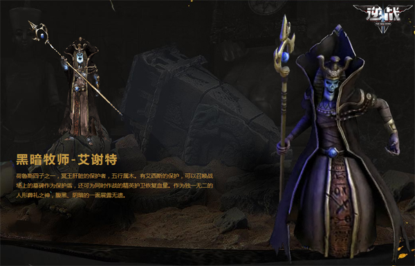 黑暗牧师-艾谢特,荷鲁斯四子之一,冥王肝脏的保护者,五行属木。有艾西斯的保护,可以召唤战场上的墓碑作为保护盾,还可为同时作战的精英护卫恢复血量。作为独一无二的人形葬礼之神,腹黑、阴暗的一面展露无遗。
