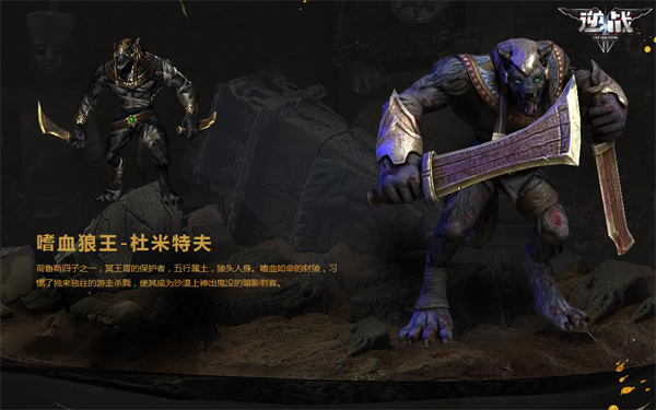 嗜血狼王-杜米特夫,荷鲁斯四子之一,冥王胃的保护者,五行属土,狼头人身。嗜血如命的豺狼,习惯了独来独往的游走杀戮,使其成为沙漠上神出鬼没的暗影刺客。