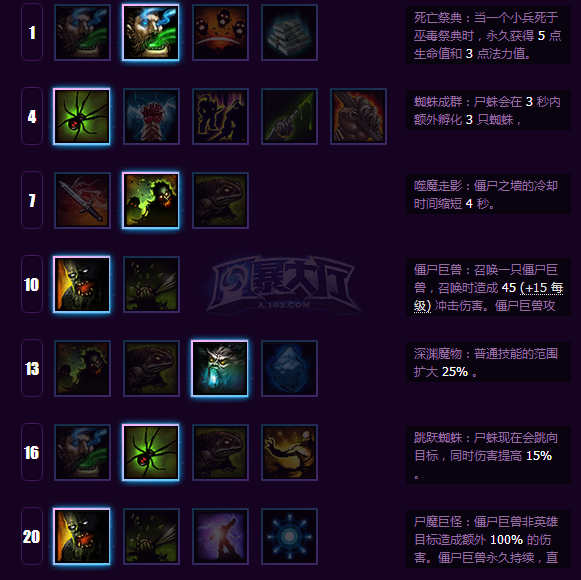 目前最主流的加点方案,主蜘蛛输出磨血,尸墙围住敌人后再召出巨尸打爆发。20级强化大招的主要意义是能在团战中召唤出第二只巨尸,对水元素、钻头也有着不可忽视的克制能力。1级的死亡祭典更不必多说了,是纳兹波后期团战存活的重要保障。