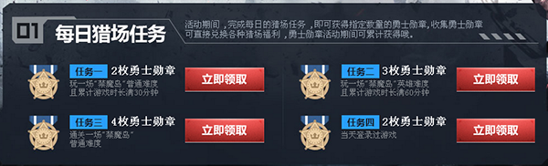 活动期间 ,完成每日的猎场任务 ,即可获得指定数量的勇士勋章,收集勇士勋章可直接兑换各种猎场福利 ,勇士勋章活动期间可累计获得哦。