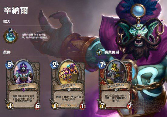 战士试炼的BOSS也是辛纳尔,你会获得一套嘲讽战,与BOSS周旋,起手找武器和低费随从比如赛场观众,闪金镇步兵等。当你都是嘲讽随从时,如果能抓到加固,就应该十拿九稳了。看来暴雪在推销嘲讽战的思路。
