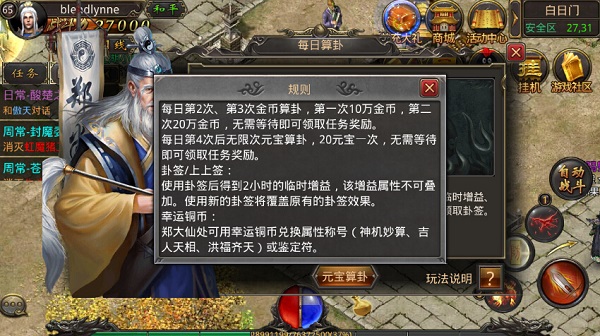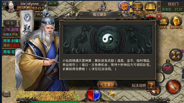 开启算卦之后,我们可以在白日门的郑大仙处进行算卦,每天第一次算卦都是免费的,等待10秒钟我们就可以开启卦,得到随机加成以及相应奖励,但是后面2次金币算卦需要10W和20W的金币,再接着就需要20元宝进行算卦了。