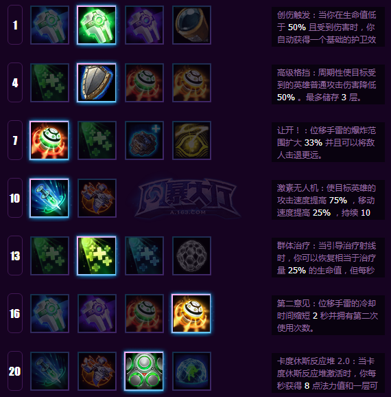 自保与手雷控场型加点,舍弃了净化术和16级的两种护卫天赋,点出“让开!”和“第二意见”来强化手雷的防守、搅场能力。