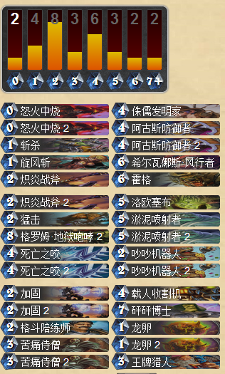 ps:因为霍格表现一般,我现在考虑把他换成周卓,一方面这套牌只有7张法术而且对其他职业有用的也不多,躲在嘲讽后面单上周卓不亏,另一方面也能作为洛欧塞布的补充在加固之后上场骗一波解场牌,因为我没有周卓,所以恳请有兴趣的大神帮忙测试一下。