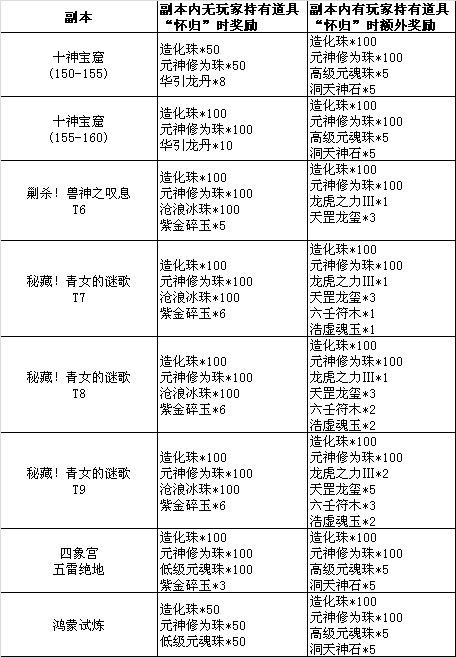 持“怀归”下副本额外奖励列表