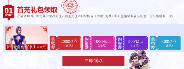 5¡¢Ê׳äÀñ°üÖ»ÐèÒª»î¶¯ÆÚ¼äÊ״γäÖµNZµãÂú1000¼´¿ÉÁìÈ¡£¬µ«Ã¿¸öQºÅ½öÏÞÁìȡһ´Î£¬£¨ÄÚº¬Ð´ºÅ®½ÇÉ«60Ìì/2000NZµã/1000NZµã/500NZµã/200NZµã/100NZµã¹ºÎïȯ¸÷Ò»£©£»