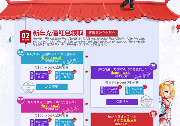 »î¶¯ÆÚ¼ä£¬ÀۼƳäֵĿսµã¼´¿É»ñµÃ³äÖµ»ý·Ö£¬Ã¿³äÖµ100NZµã¿ÉÃâ·Ñ»ñµÃ1µã³äÖµ»ý·Ö¡£³äÖµ»ý·Ö¿ÉÈÎÒâ¶Ò»»Ö¸¶¨Ð´º·µÀûºì°ü¡£ÁìÈ¡¹ý·µÀûºì°üÍæ¼Ò´º½Úºó¿É»ñµÃдº´ó¼ªÈÙÓþÃûƬ¼°³É¾Í(ÓÀ¾Ã)£¬ÁìÈ¡ÁËǧìû·µÀûºì°üµÄÍæ¼Ò£¬»¹¿É»ñµÃ2016Äê¡°ºïÄêǧìûÓи£¡±×ðÏíÃûƬ¼°³É¾Í(ÓÀ¾Ã)¡£