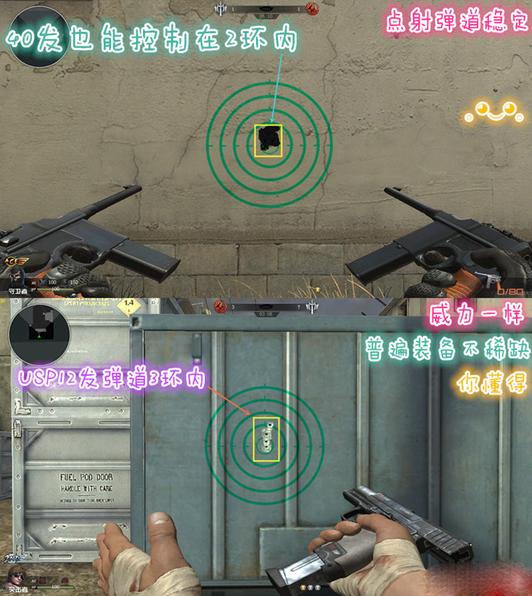 此外就是极其稳定的弹道了,虽然在现实中这把手枪是扫射优势,但FPS中手枪还是点射的主儿,40发的子弹全部打出去也能控制在二环内,小编没怎么压枪,要是高手的话能控制在一环内,因此如果是蹲点阴的话点射优势是十分明显的,与之同比,USP12发也会飘至3环,因此稳定的弹道配上弹药补给,在某些领域能提供不少的支持。