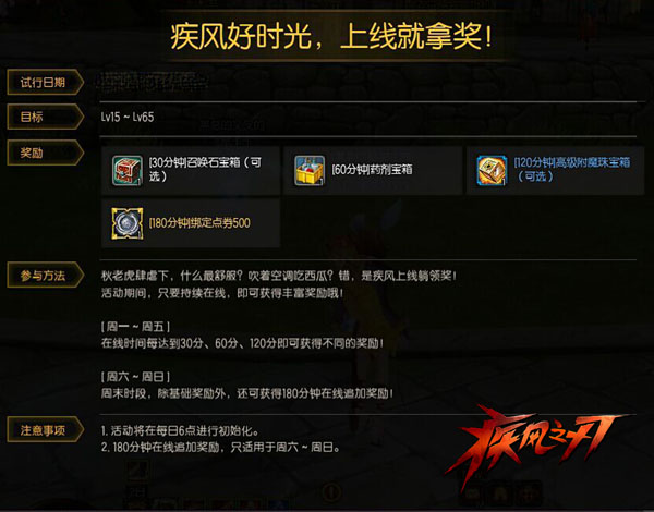 疾风好时光,上线就拿奖!《疾风之刃》国庆活动重新推出在线累积奖励活动,15级以上玩家在线一定时间就能获得奖励。该活动分为平日和周末,日常(平日)登录在线累积时间达到 30, 60, 120分钟就能领取奖励;周末登录在线累积时间达到 30, 60, 120, 180分钟就能领取奖励。